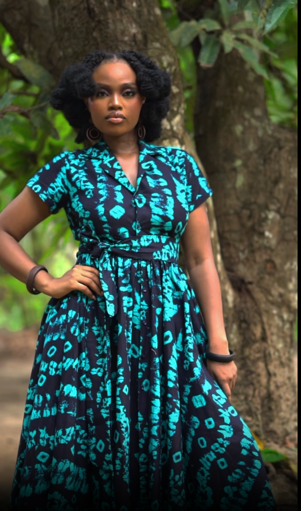 Elegant Ankara maxi dress with notched collar and belt, perfect for versatile styling.