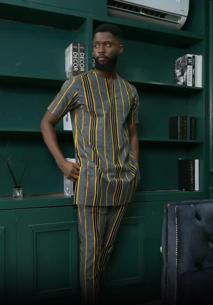 ZANO Suit: Vertical stripes, Ankara fabric, modern elegance. Perfect for weddings.